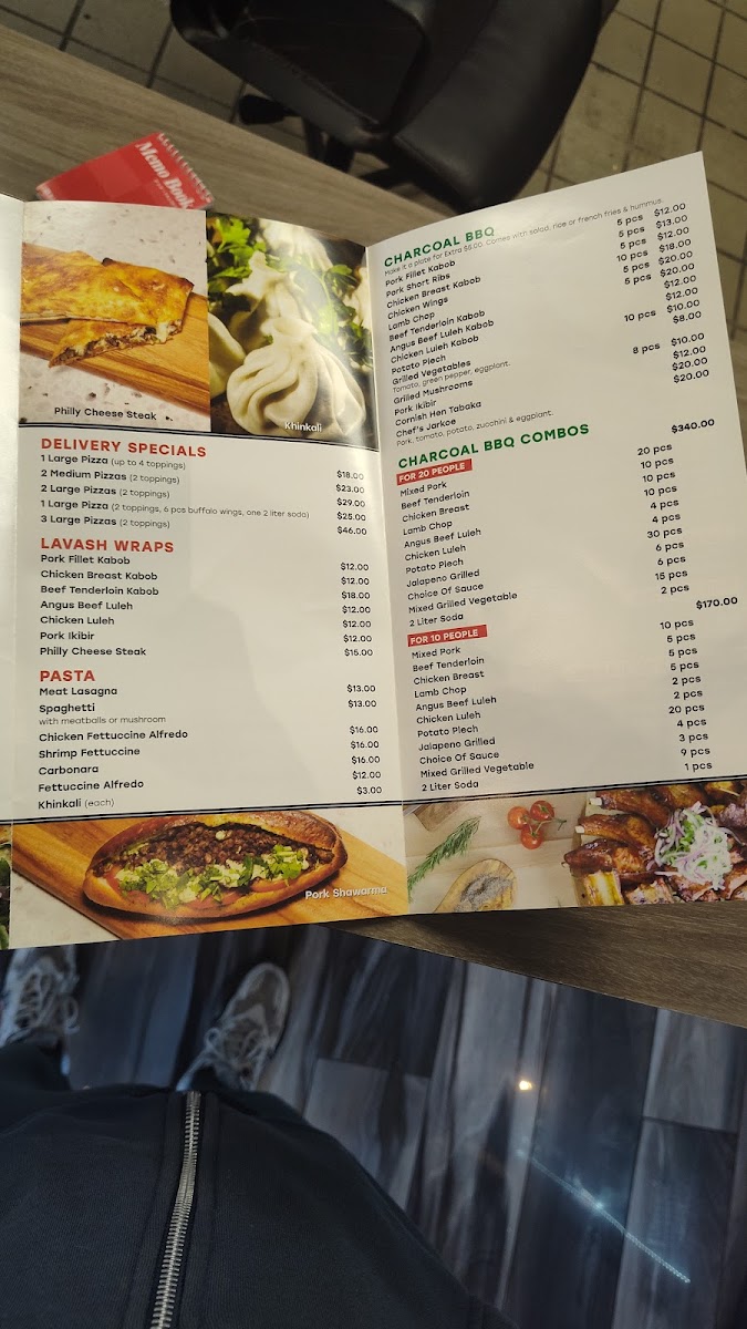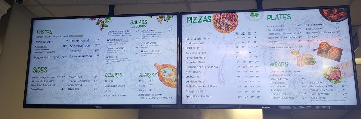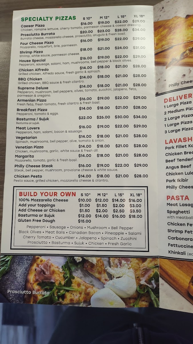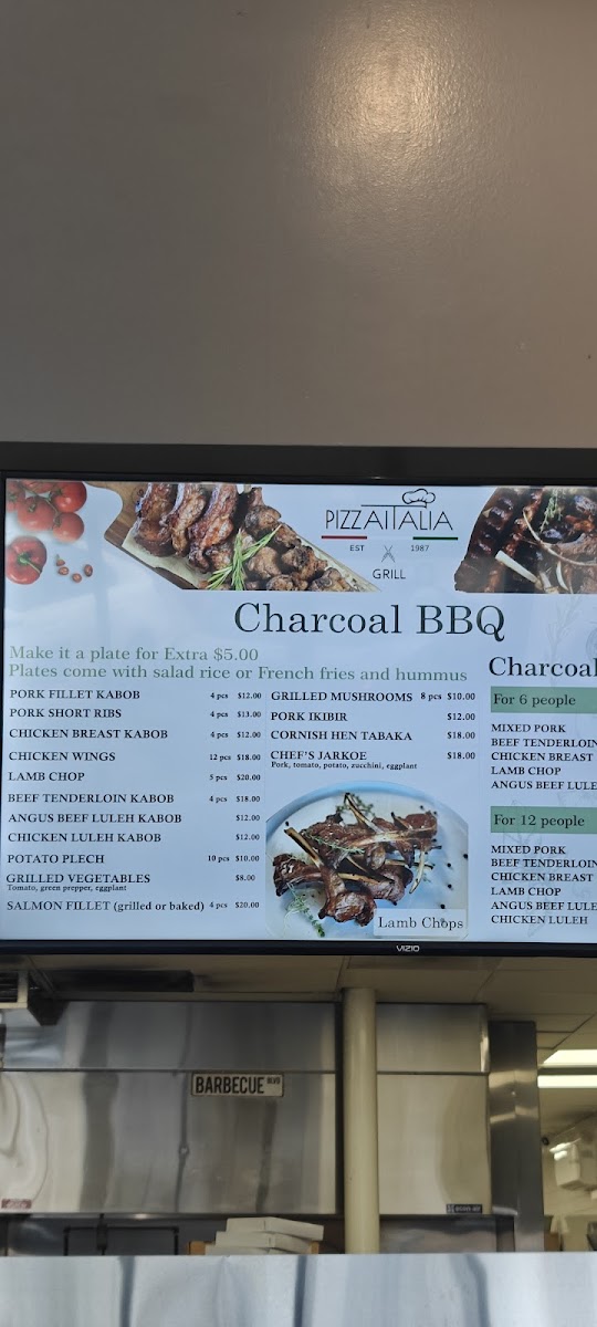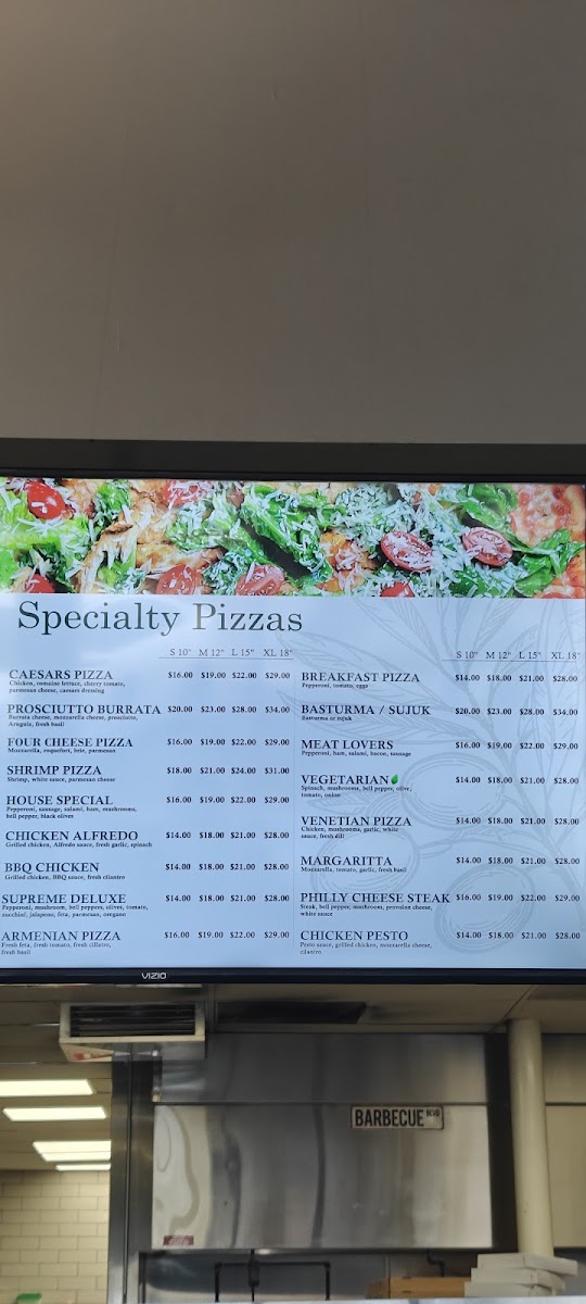 Pizza-Italia Grill in North Hollywood delivers a menu that balances classic Italian favorites with inventive twists. Starters like Chicken Noodles and Lentil Soup set a comforting tone, while the stone oven offerings-5 Cheese Italian Flat Pie, Megrelian Khachapuri, and Ajarsky Khachapuri in options of one, two, or three eggs-showcase their dedication to traditional flavors with rich, melty textures. Pizza enthusiasts can choose from specials such as 3 Large, 1 Large Pizza, 2 Medium Pizzas, or 2 Large Pizzas, alongside specialty pizzas like Venecian, Breakfast Pizza, Vegetarian Shrimp Pizza, and Supreme Deluxe. Fresh salads-including Greek, Shrimp Caesars, Caesars, Armenian, and Chicken Caesars-provide lighter options, while lavash wraps like Pork Ikibir, Chicken Luleh, Philly Cheese Steak, Pork Fillet Kabob, and Beef Tenderloin Kabob offer portable, hearty meals. For sides, the menu delivers comfort with Pan Fried Crispy Potato Wedges, Cheese Garlic Bread, Garlic Bread, Buffalo Wings, and Humus, paired with sauces ranging from BBQ Sauce and Cocktail Sauce to Sweet Chilly, Pesto, and Cheddar Sauce. Pasta lovers can indulge in Penne Pesto, Fettuccine Alfredo, Chicken Fettuccini Alfredo, or Meat Lasagna, while the khinkali (5 pieces) add a unique Eastern European touch. For larger gatherings, the charcoal BBQ combos-For 10 People or For 20 People-and individual BBQ items like Lamb Chop (4pcs), Chicken Breast Kabob (5pcs), Pork Short Rib (4pcs), Pork Ikibir, and Pork Chop (2pcs) bring smoky, savory flavors to the table. Drinks like Akroshka, Water, 2-Liter Soda, Can Soda, and Sparkling Lemonade complete the experience, and for a fully personalized treat, the Build Your Own Pizza options range from Small 10", Medium 12", Large 15", to XL 18", all featuring 100% mozzarella cheese. Overall, the menu’s diversity ensures that whether you’re craving traditional pizza, inventive baked pies, hearty BBQ, or fresh salads, Pizza-Italia Grill has a dish to satisfy every palate.